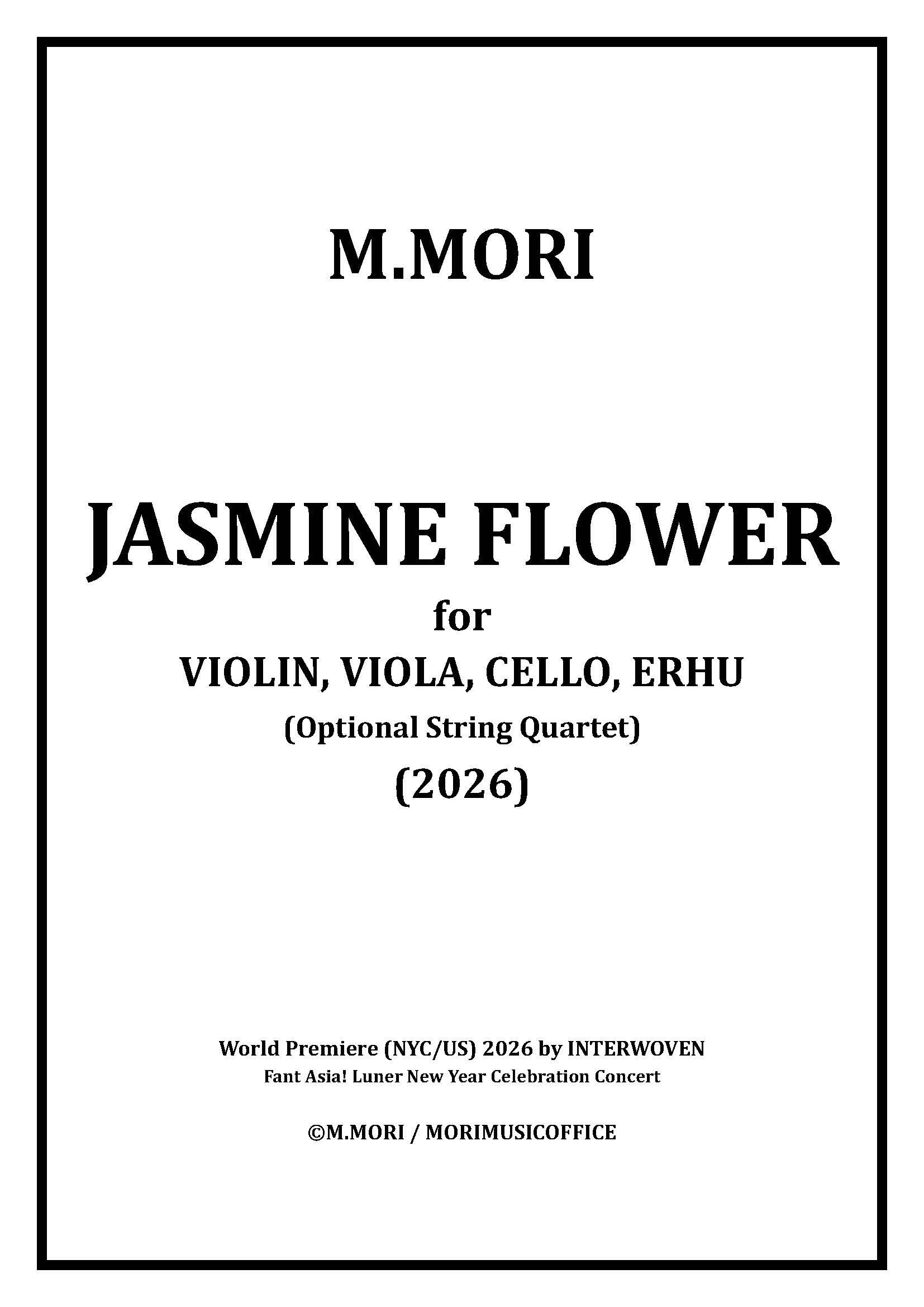 Format: Digital Download (Adobe PDF)/ Please download from a computer, as smartphones, tablets, and other mobile devices may not function properly. / Digital items are available for purchase only by credit card or via “Pay ID (Pay Later)." /For Violin, Viola, Cello and Erhu (Optional String Quartet)/ Duration: Approximately 3 minutes /フォーマット:デジタルダウンロード(Adobe PDF)/携帯電話スマートフォンやタブレットなどは正常にダウンロードできない場合があるため、パソコンからダウンロードいただきますようお願い申し上げます。/「デジタルコンテンツであるこの商品は、クレジットカード決済、「あと払い(Pay ID)」でのみご購入いただけます。/ ヴァイオリン、ヴィオラ、チェロ、二胡のために(弦楽四重奏でも演奏可能)/ 演奏時間:約3分